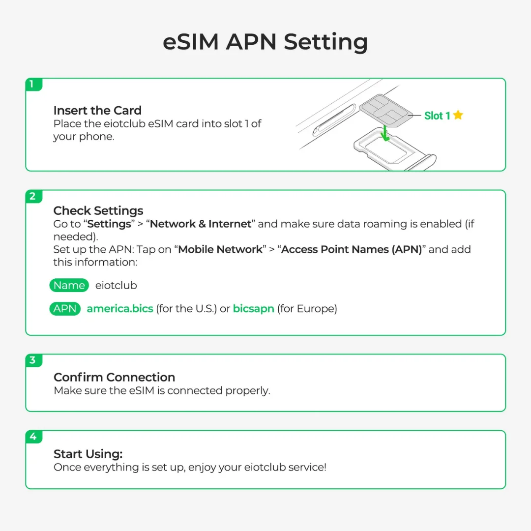 Insert the eSIM card into your iPhone, and it should be ready to use the preset data. However, if you need to obtain a new eSIM profile, you may need to download and manage it on an Android device or through EIOTCLUB eSIM Card Reader first. The eSIM configuration require setup with an Android device or reader.